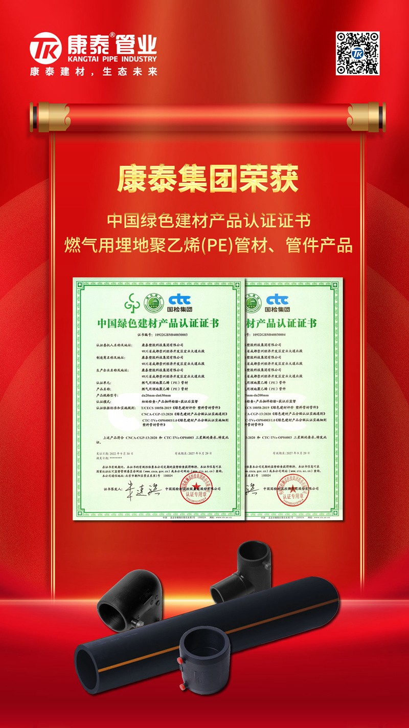 近日,康泰塑膠的給水用聚乙烯(PE)管材、管件產(chǎn)品,燃氣用埋地聚乙烯(PE)管材、管件產(chǎn)品,冷熱水用聚丙烯(PPR)管材、管件產(chǎn)品,埋地用聚乙烯(PE)雙壁波紋管材產(chǎn)品,冷熱水用耐熱聚乙烯(PE-RT)管材產(chǎn)品,給水用鋼絲網(wǎng)增強聚乙烯復(fù)合管材產(chǎn)品順利中國國檢測試控股集團股份有限公司認證審核,獲得中國綠色產(chǎn)品認證證書。充分展現(xiàn)了康泰塑膠獲證產(chǎn)品在多種綠色屬性和考核指標(biāo)的硬核實力。