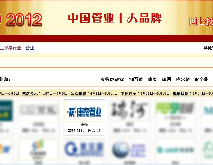 圖為康泰塑膠科技集團獲2012年中國管業(yè)十大品牌評選網(wǎng)頁