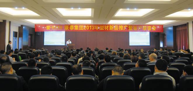 ??? 2013年3月30日,康泰集團2013年型材新品推廣暨客戶聯誼會在集團總部五樓多功能會議室隆重召開,本次會議意在為成都、四川、重慶的門窗組裝廠、裝飾公司及開發(fā)單位的眾位好友推薦康泰型材新品,加強經銷商與客戶之間的相互交流學習,全面了解公司的生產實力、技術研發(fā)、營銷服務等相關領域,特舉辦此次盛會。本次會議以“鑄就高品質型材,開拓互惠雙贏新局面”為方針,以提升康泰型材在客戶心目中的認知度為戰(zhàn)略目標,大家各抒己見,出謀劃策,共商康泰型材2013年的發(fā)展戰(zhàn)略。