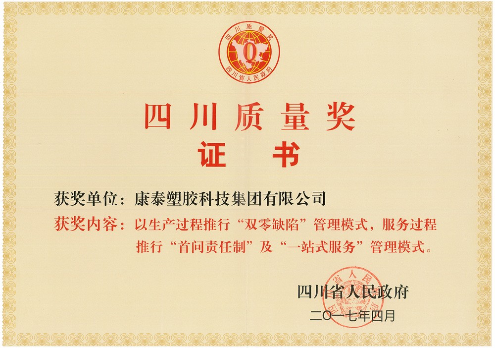 三是質(zhì)量強(qiáng)企,獲得第四屆四川質(zhì)量獎(jiǎng)??堤┘瘓F(tuán)以“圍繞全球顧客、不斷改善,追求產(chǎn)品零缺陷”的質(zhì)量方針,貫徹“產(chǎn)品如人品”的質(zhì)量理念,全面覆蓋ISO9001、ISO14001、OHSAS18001三體系,實(shí)施全員、全面質(zhì)量管理,通過(guò)導(dǎo)入PDCA循環(huán)管理和QCC體系,嚴(yán)格質(zhì)檢把控,確保從原料進(jìn)廠到產(chǎn)品出廠的優(yōu)質(zhì)質(zhì)量保障。康泰先后榮獲全國(guó)質(zhì)量誠(chéng)信標(biāo)桿典型企業(yè)、全國(guó)質(zhì)量檢驗(yàn)穩(wěn)定合格產(chǎn)品、全國(guó)百佳質(zhì)量誠(chéng)信標(biāo)桿示范企業(yè)等榮譽(yù)稱號(hào)。2017年,憑借“生產(chǎn)過(guò)程推行‘雙零缺陷’管理模式,即供應(yīng)鏈來(lái)料100%合格進(jìn)廠、產(chǎn)品質(zhì)量100%合格出廠,始終貫徹執(zhí)行態(tài)度零容忍、質(zhì)量零缺陷的‘雙零缺陷’管理模式”。康泰集團(tuán)從全省眾多優(yōu)秀企業(yè)中脫穎而出,成為唯一獲得第四屆“四川質(zhì)量獎(jiǎng)”的塑膠建材企業(yè)。